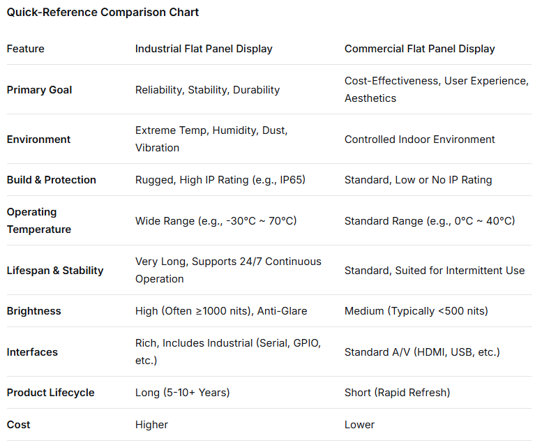 In short, commercial flat panel displays are “built for experience,” prioritizing value and aesthetics. Industrial flat panel displays are “built for the mission,” pursuing ultimate reliability, durability, and stable performance in adverse conditions. When choosing, for standard indoor applications, commercial displays are cost-effective. For challenging environments or continuous operation requirements, investing in an industrial display is a wise decision to ensure long-term system stability and reduce the cost of downtime.
