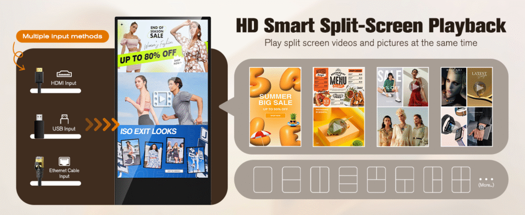 For environments with bright lighting, the 350 nits screen brightness cuts through glare, while the 4000:1 contrast ratio delivers deep blacks and vivid colors. This digital signage display ensures your promotional videos, high-resolution images, and animated content always look their best, making it a perfect digital advertising display tool.