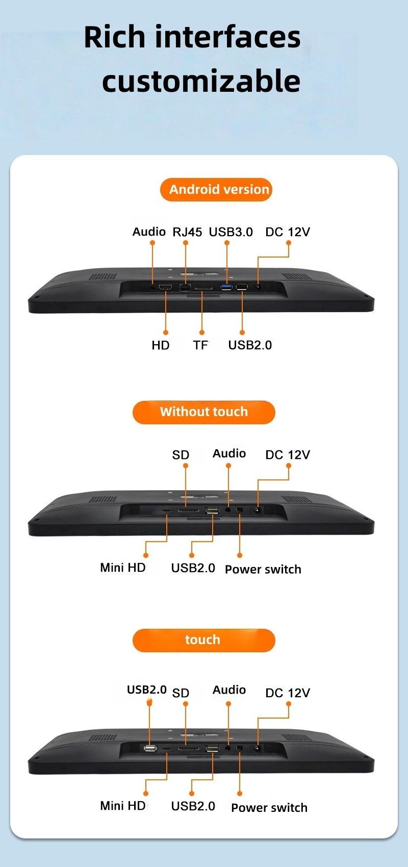 | USB 2.0 interface | 1 (480Mbps high-speed transmission) (Note: The USB interface does not support touch and is used for multimedia) | ||||